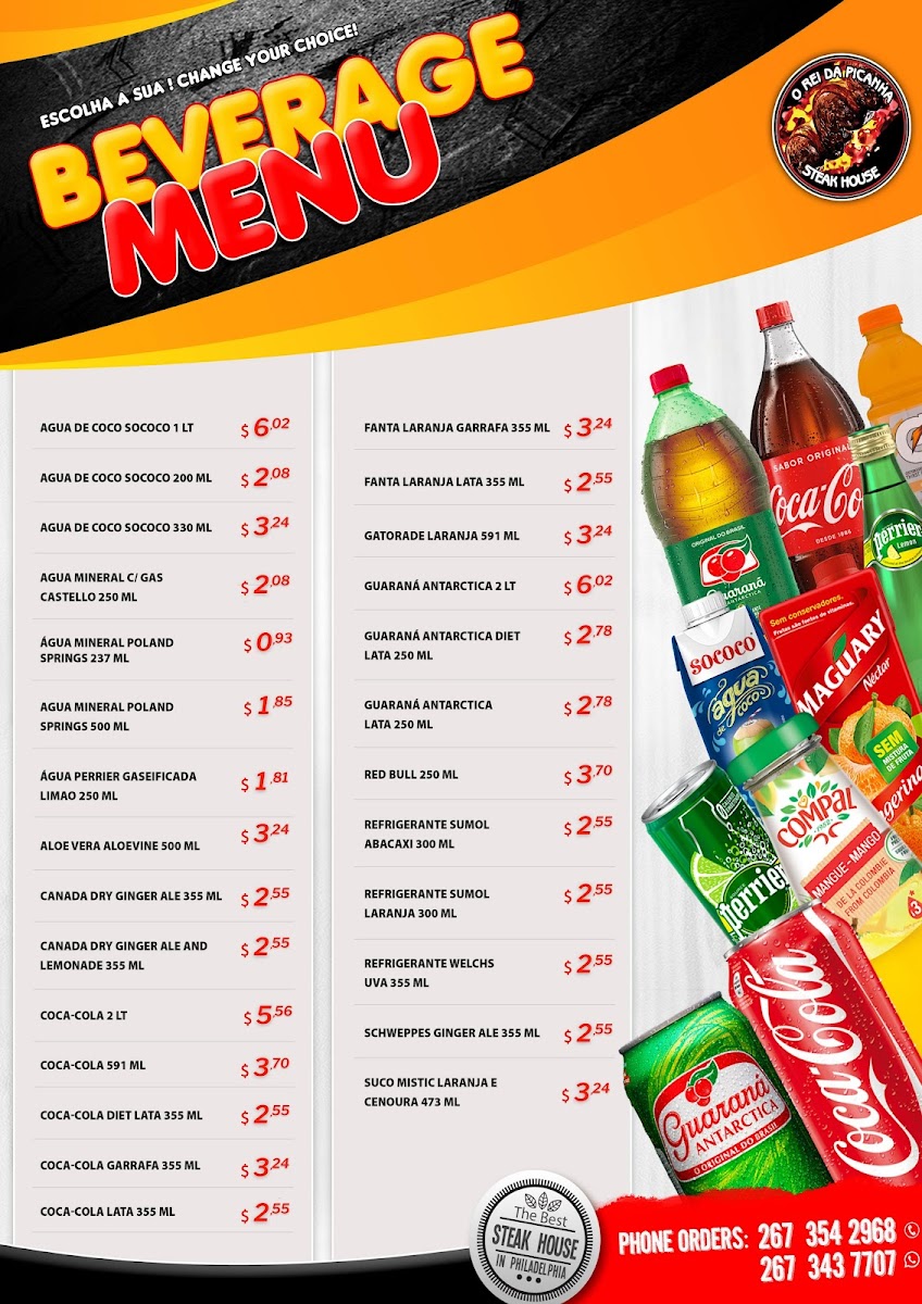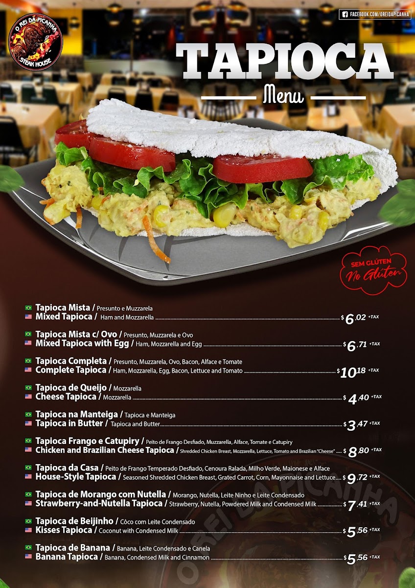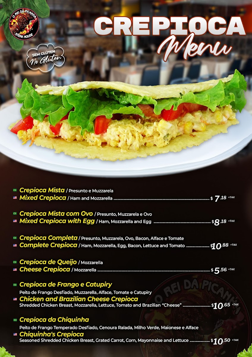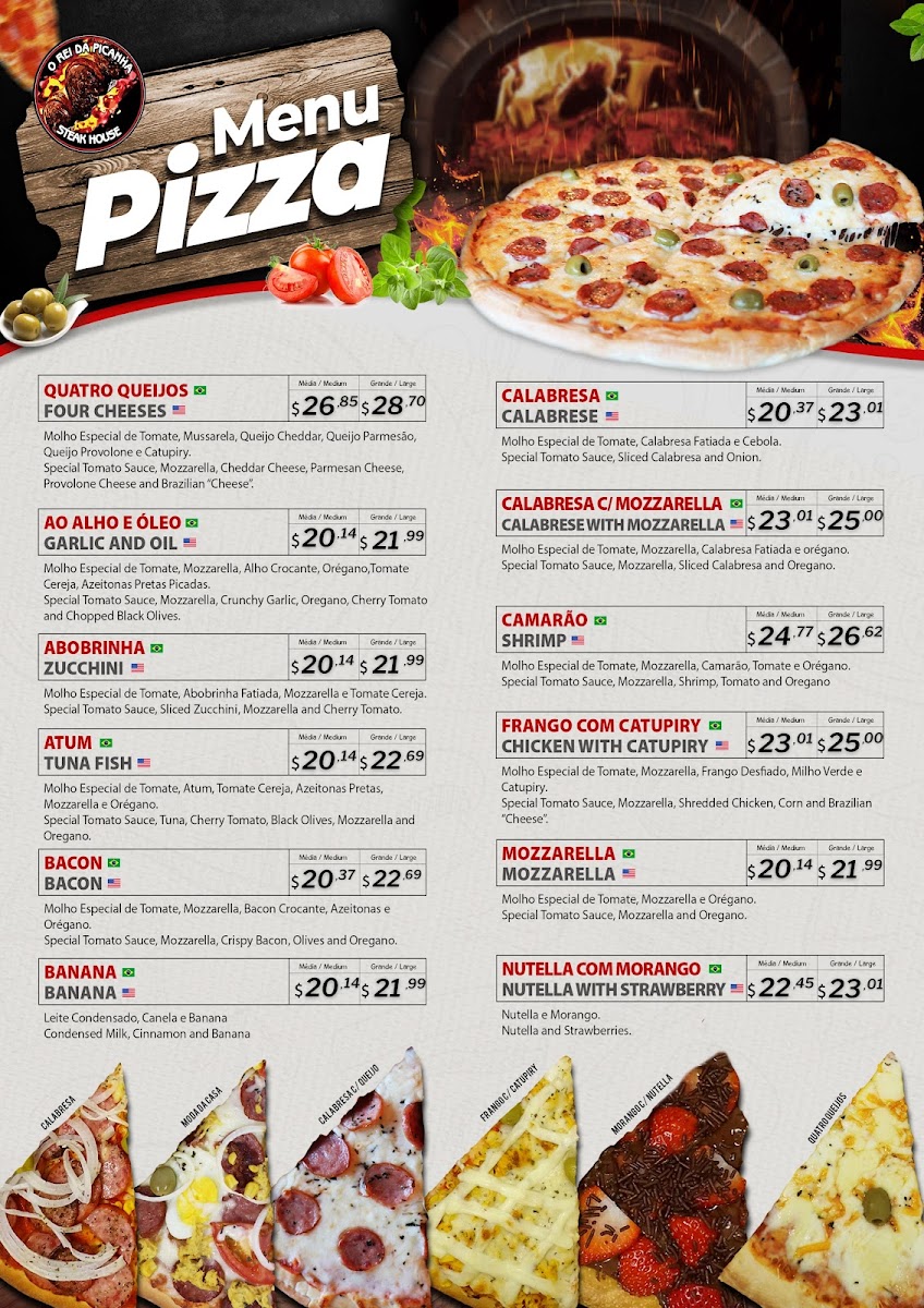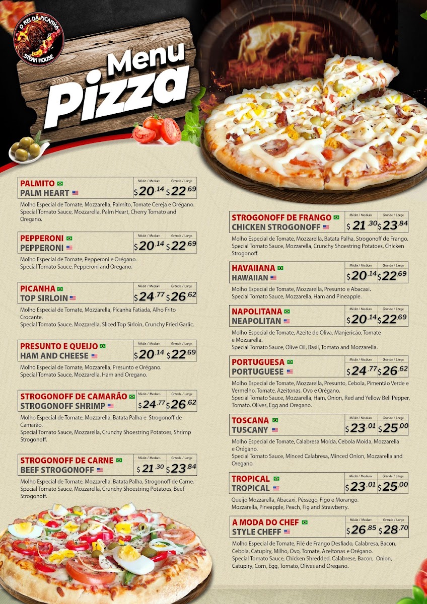 Picanha grelhada grilled top sirloin. Servings: white rice, beans, house salad and a side of your choosing french fries, fried bananas or yucca fries, cassava fries. Option: garlic and oil or grilled onion. Servido com: arroz, feijao, salada da casa e um tipo de fritura, batata, banana ou mandioca. Opcional: alho e oleo ou cebola grelhada. Your choice of dressing.