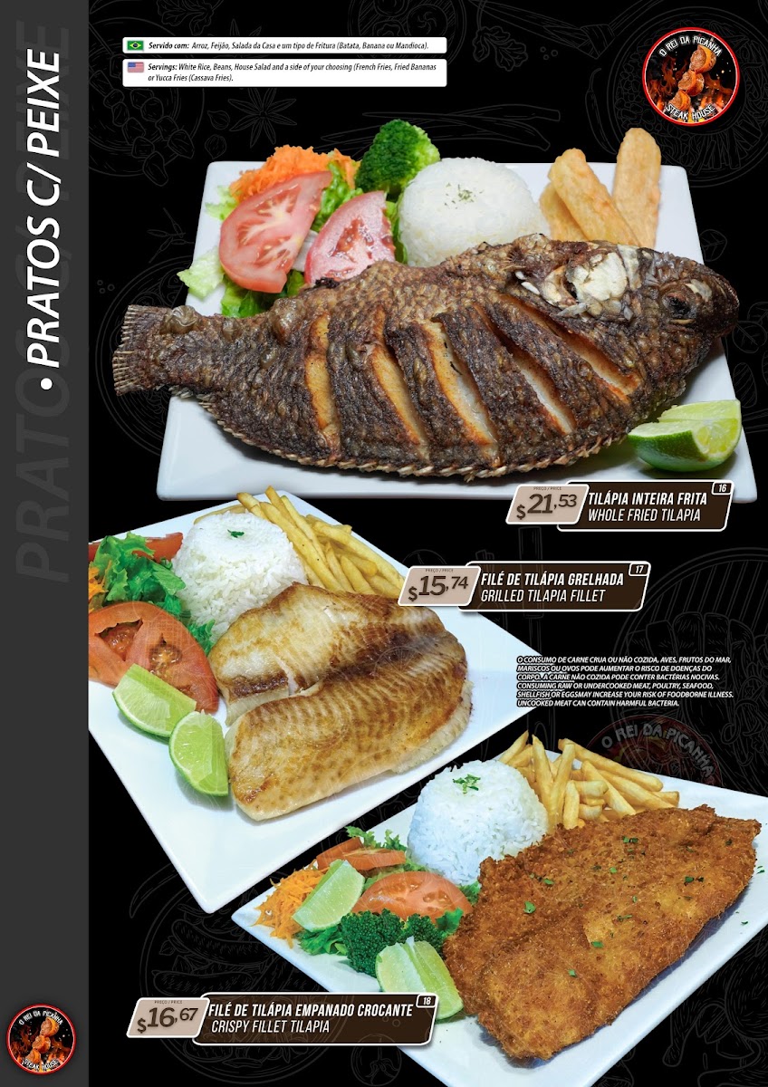 File de tilapia grelhada. Servings: white rice, beans, house salad and a side of your choosing french fries, fried bananas or yucca fries, cassava fries. Option: garlic or oil upon request. Servido com: arroz, feijao, salada da casa e um tipo de fritura, batata, banana ou mandioca. Opcional: alho e oleo ou cebola grelhada. Your choice of dressing.